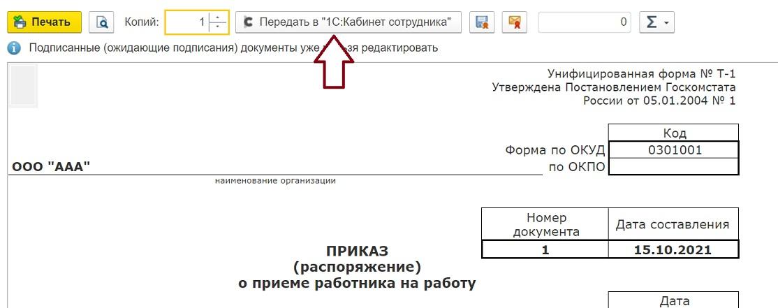 В программах 1С есть возможность загружать печатные формы документов (например, шаблон трудового договора, принятый в вашей организации). Такие документы можно передавать в личный кабинет сотрудника нажатием кнопки «Передать в 1С:Кабинет сотрудника».