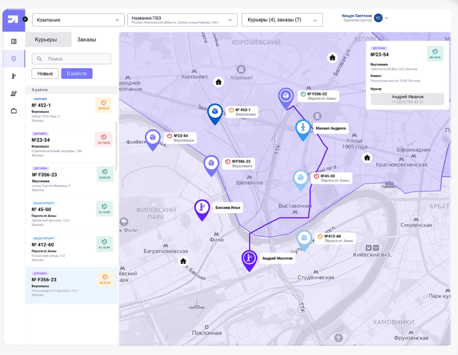 - Мониторинг курьеров: Отслеживание местоположения и активности курьеров в режиме реального времени для обеспечения контроля и повышения эффективности доставки.
