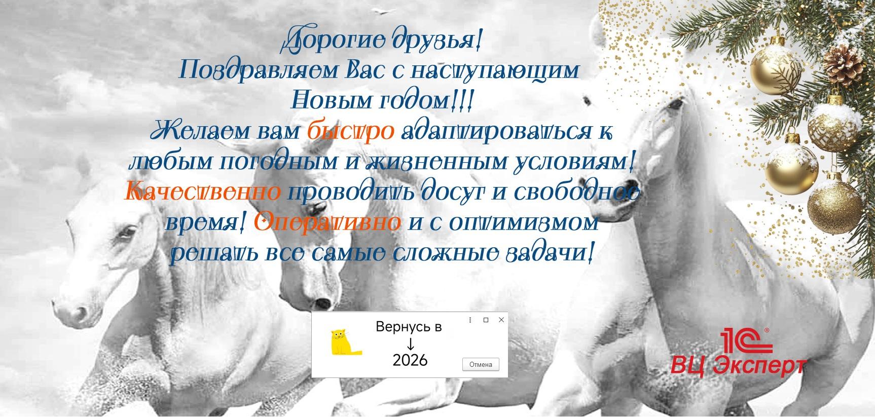 Команда 1С:Франчайзинг.ВЦ Эксперт будет рядом, чтобы оперативно и с оптимизмом помогать вам в развитии и процветании вашего Предприятия. Пусть 2026 год принесет новые возможности, устойчивый рост и яркие профессиональные победы!
